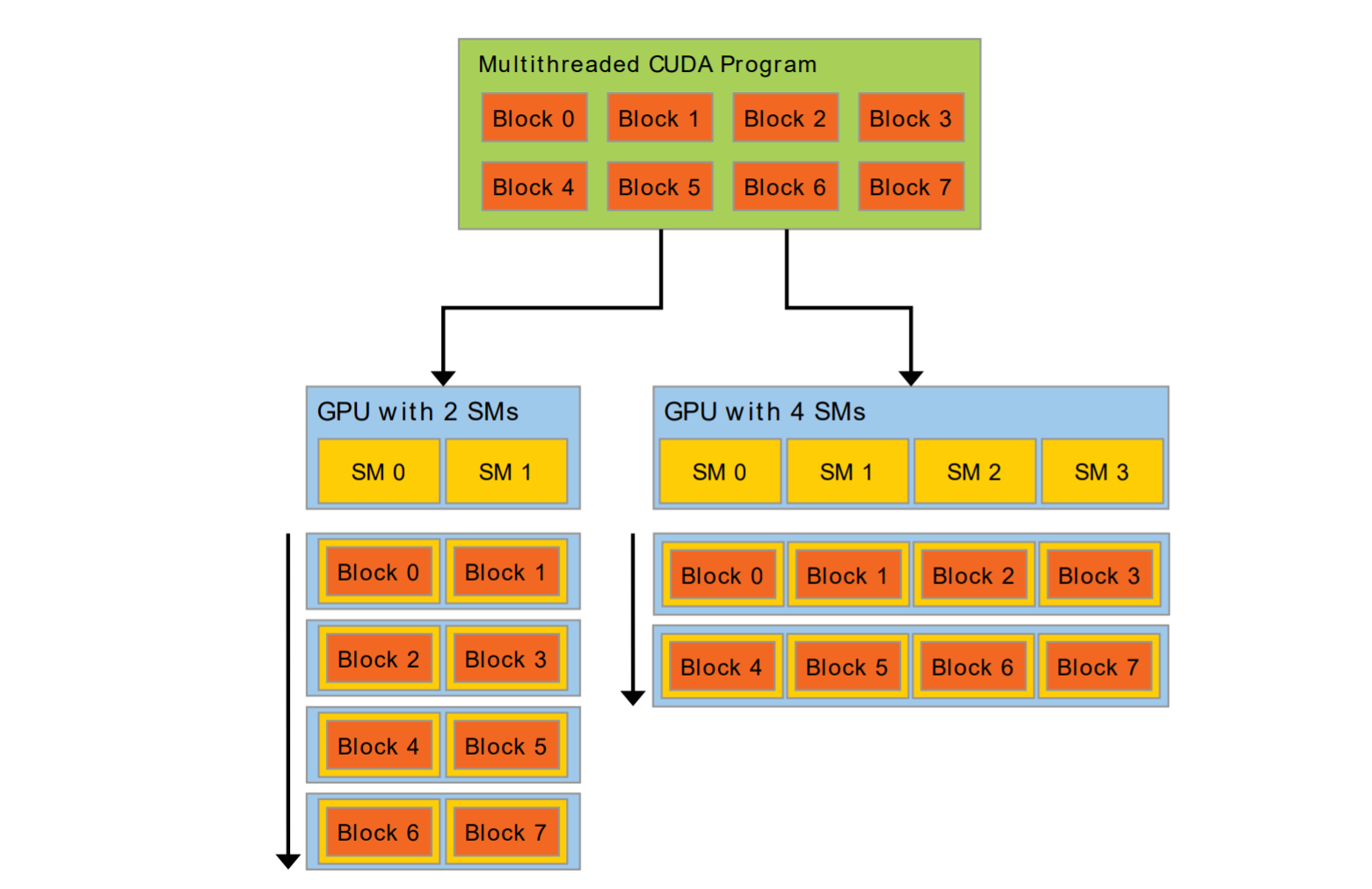 在启动并行程序的时候,我们会产生一个Grid,Grid包括多个SM的计算任务,但是我们不需要考虑运行的硬件到底有几个SM,GPU驱动会自动分配SM任务,如下图