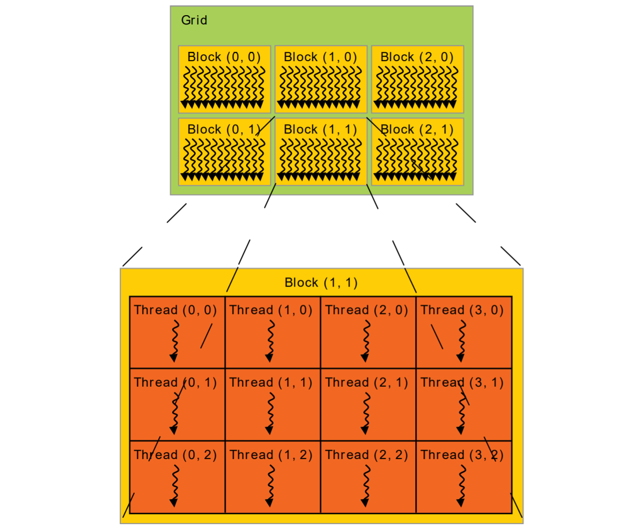 程序是自动并行运算的,在编程层面,我们创建的概念是一个Grid,一个Grid包含多个Blocks(线程块,可指定数量),每一个Block包含多个Threads(计算的最小单位,单个线程,可指定数量),所有的Threads一起运行,如下图