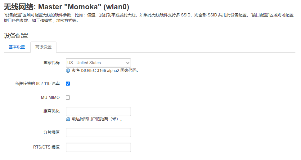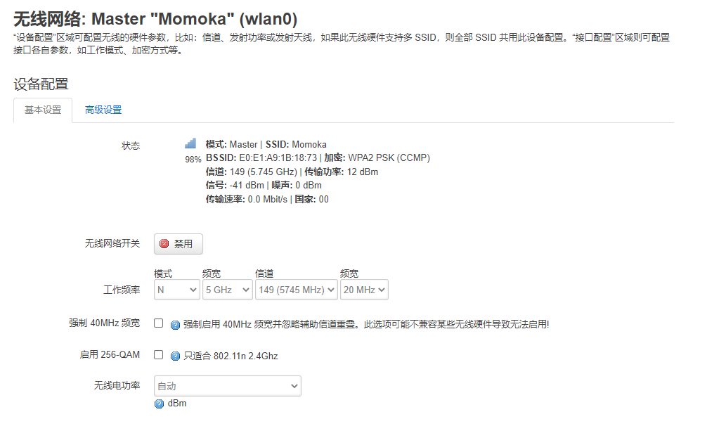 模式,信道,频宽等都是可能会影响到网卡的工作的,如果配置不正确,可能会无法启用无线模块,提示类似:「OpenWrt无线未开启或者未关联5g」。所以无线网卡不能正常工作时,除了检查驱动以外,顺便可以调整一下配置,尝试一下。 具体的配置方式如下