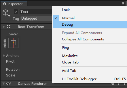 Unity的Inspector窗口可以开启Debug模式