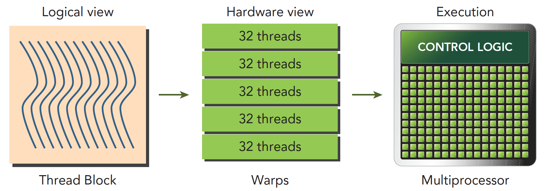Block是逻辑概念,当一个Block被分配到一个SM上后,会分为多个线程束,线程束是硬件概念,现在的硬件一般是32个线程分为一个线程束,在一个线程束中,所有线程按照单指令多线程SIMT的方式执行,每一步执行相同的指令,但是处理的数据为私有的数据