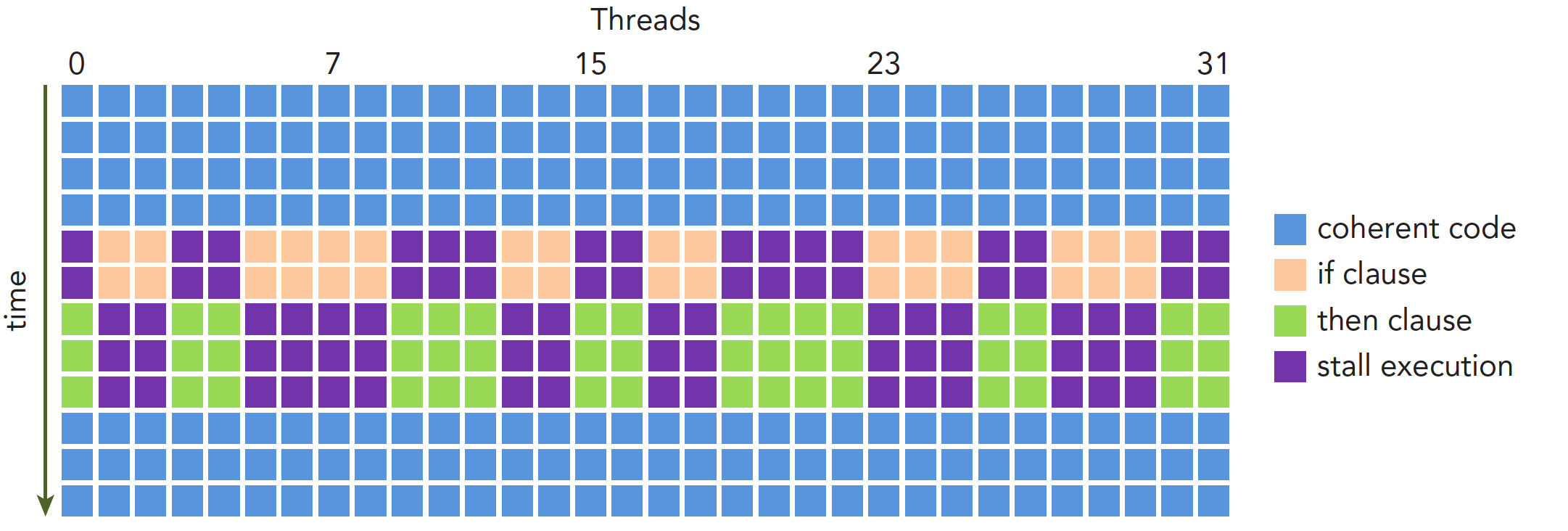 不同的线程在同一个线程束中,它们执行相同的指令,那么如果流程中存在分支,而不同的线程进入了不同的分支,那么如何处理呢?前面提到同一个线程束中的线程执行相同的指令,现在不同的线程进入了不同的分支,执行的指令必然是不同的,产生了分化,这似乎是有矛盾的。GPU解决矛盾的办法就是等,每一个分支的指令,分配命令的调度器都会向所有线程发出命令,不应该执行这个分支的线程就要等,等到这个分支的所有线程都执行完毕,收到下一个命令,才可以继续。很明显这会造成性能的下降,分支越多,分化越严重,就越像串行的程序(一些线程等其他的线程结束才能继续),性能损耗也就越严重。执行过程如下图