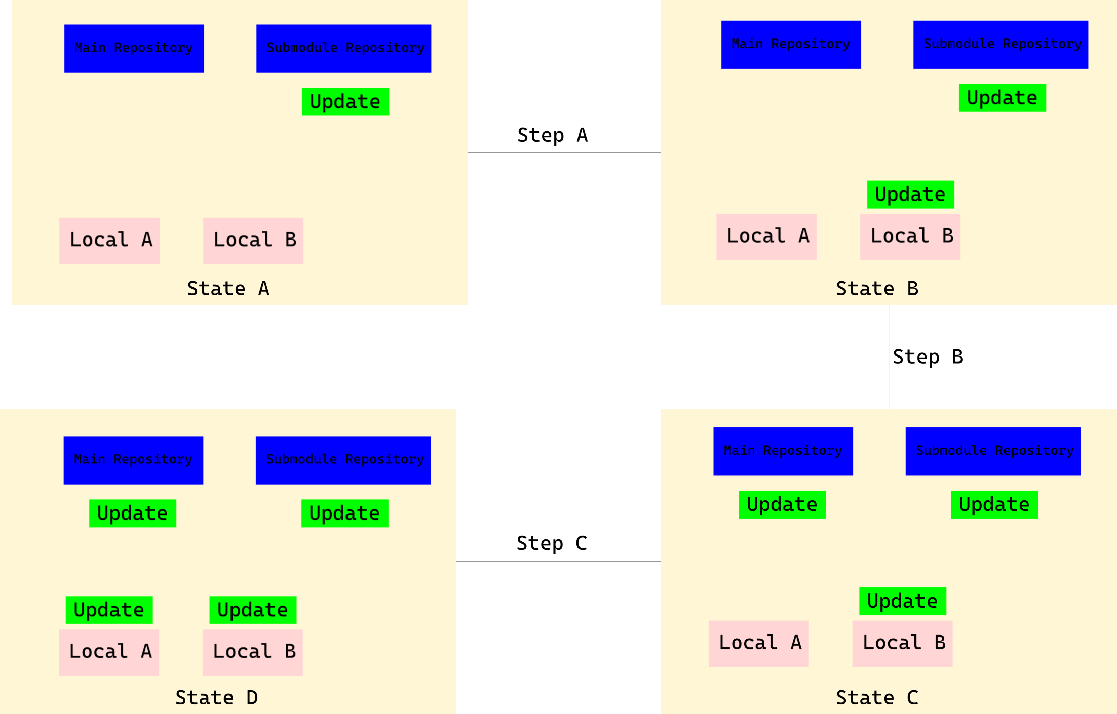 通过远端的两个Repository,并不能直接更新子模块,必须经过本地。将本地子模块的更新推送到主Repository的远程后(上面一个步骤),另一个贡献者的本地下一次正常的pull会“更新子模块”(从主Repository拉取来的内容),因为更新过后的子模块也是主Repository的一部分,受正常pull/push的影响。正常情况下,子模块远程的更新是不受正常pull/push的影响的(不能因为我使用的库的作者更新了库,我pull的时候也让我更新)。这里说的更新是从子模块的远端将变动同步到本地,而主Repository远端的子模块有更新(被其他贡献者更新了),使用正常的pull即可同步回来,这里说的子模块更新并不是这种情况。