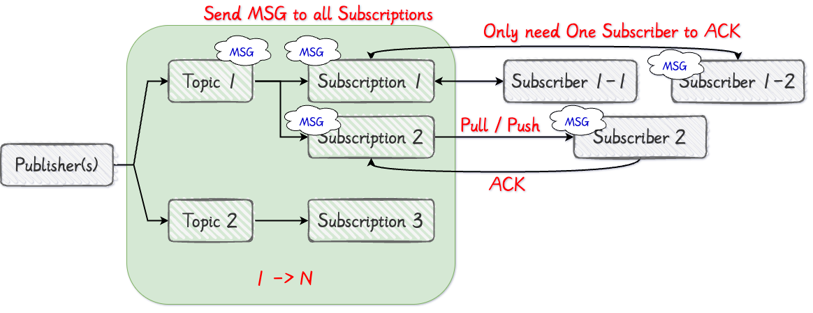 Topic T ├─ Subscription S1 ──> Worker A, Worker B, Worker C (同一个订阅里的多个“订阅者实例”) └─ Subscription S2 ──> Worker X (另一个订阅)