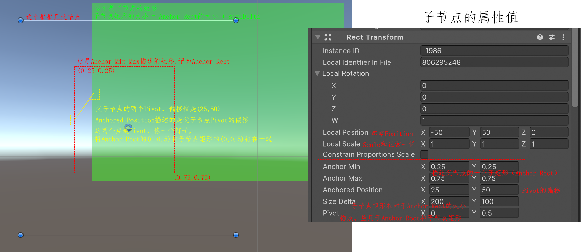 UI的Transform,UGUI游戏对象都应该有这个Component。RectTransform描述一个矩形,包括其大小和位置